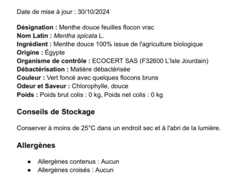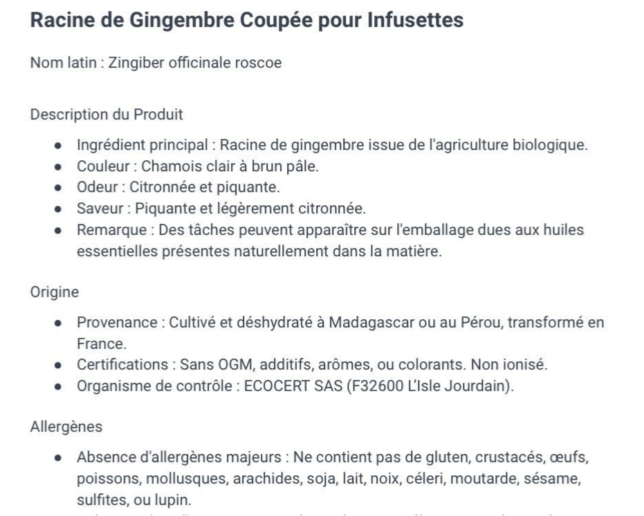 100 % fleurs d’hibiscus séchées bio (Hibiscus sabdariffa) , menthe douce bio , gingembre bio , clou de girofles bio